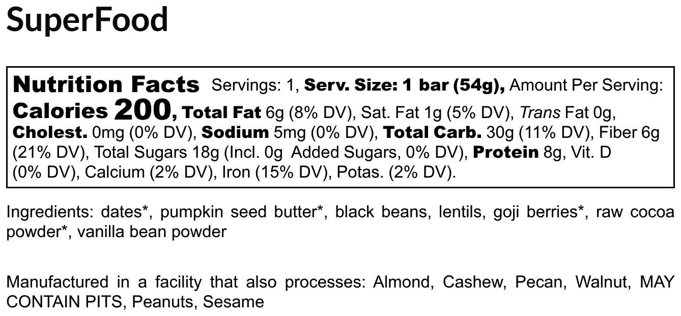 Packed with superfoods--goji berries, pumpkin seeds, cocoa powder, and beans--this bar is packed with phytonutrients and antioxidants out the yang!