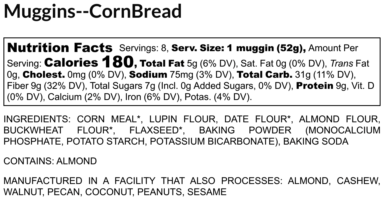 With 9 grams of protein, 9 grams of fiber, and 1/2 serving of lupin beans, CornBread Muggins is the healthiest cornbread west AND east of the Mississippi!